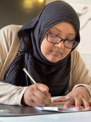 She holds ijazahs (authorizations) in Thuluth and Naskh scripts from Master Calligrapher Haji Noor Deen, as well as in Riq‘a, Diwani, and Diwani Jali scripts from Master Calligrapher Shahrayanshah Sirajuddin. Grounded in classical technique yet engaged with contemporary concerns, Farzana’s practice explores themes of colonialism, diaspora, social memory, and the lived experiences of Muslim communities, extending calligraphy into fabric, performance, and sculptural forms.